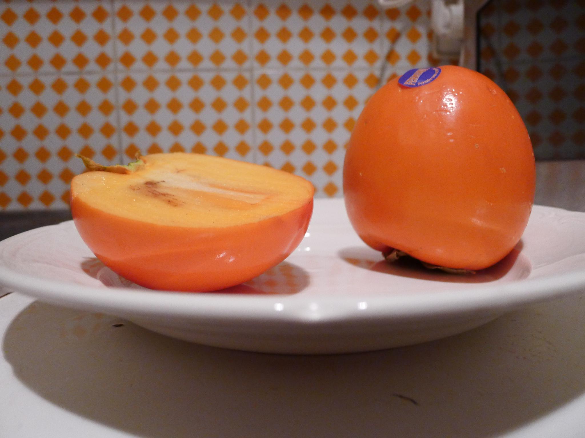 小家伙最近有点小感冒,时常咳嗽,给她买了两只柿子吃。(《本草纲目》中记载“柿乃脾、肺、血分之果也。其味甘而气平,性涩而能收,故有健脾涩肠,治嗽止血之功。”)模样金黄可爱,Amélie看到以后就抱着不放手,用小手指在盖子那里抠抠,可能以为这是一只大桔子吧!洋柿子硬邦邦的,我还特意上网搜了一下怎么吃,结果看到有人说削皮后直接吃⋯⋯为了方便喂给小家伙吃,我还是像对付苹果一样一切两半,用勺子舀给她。其味脆硬甘甜,无核,是与中国柿子不同的美食体验。