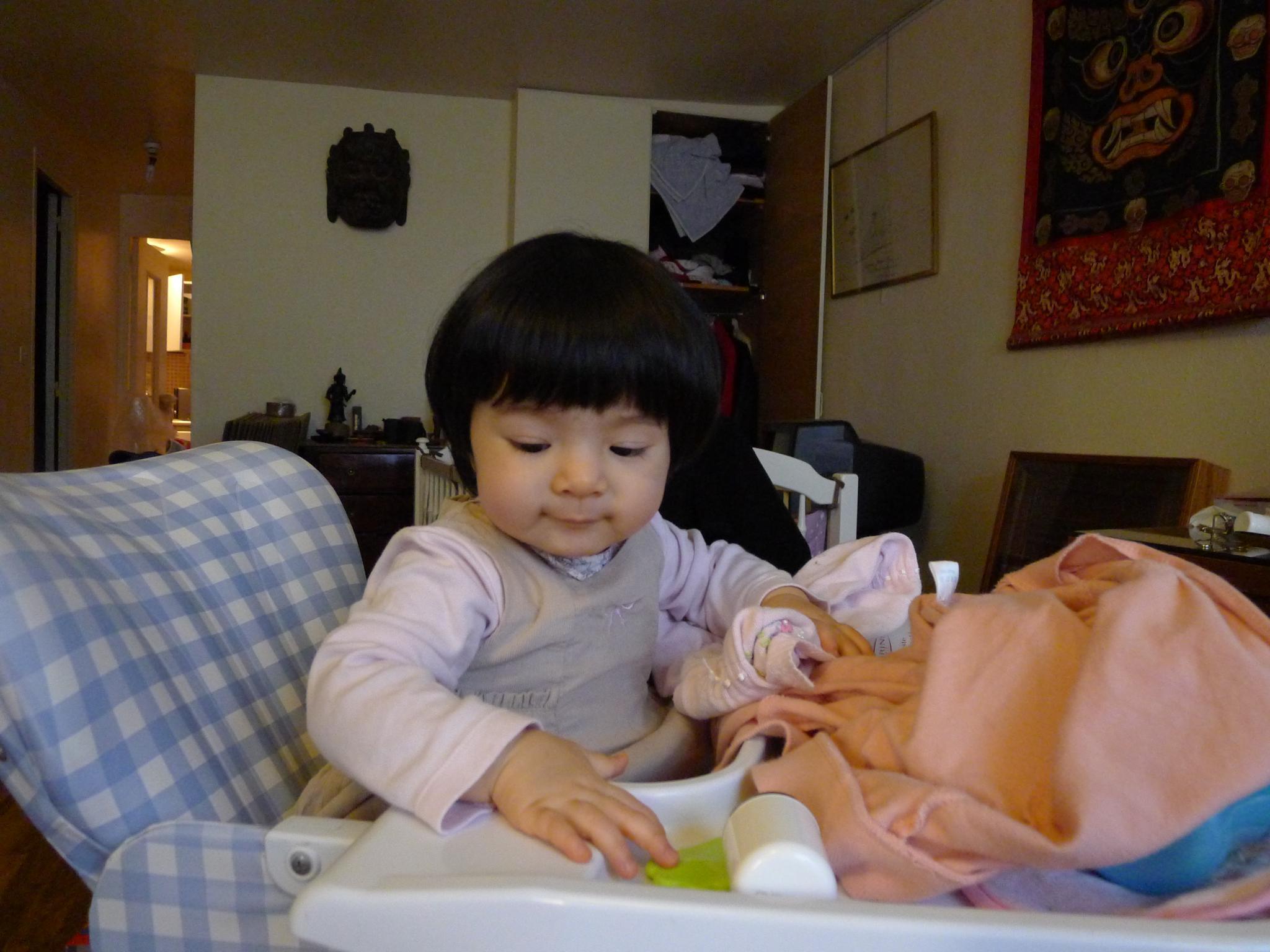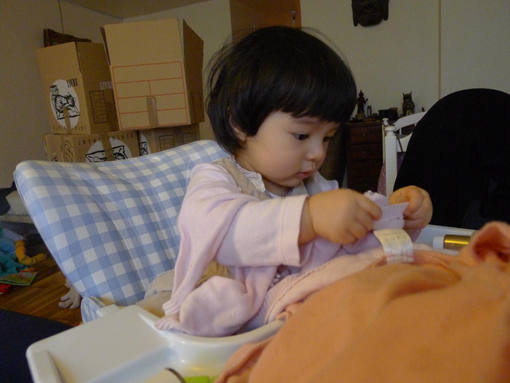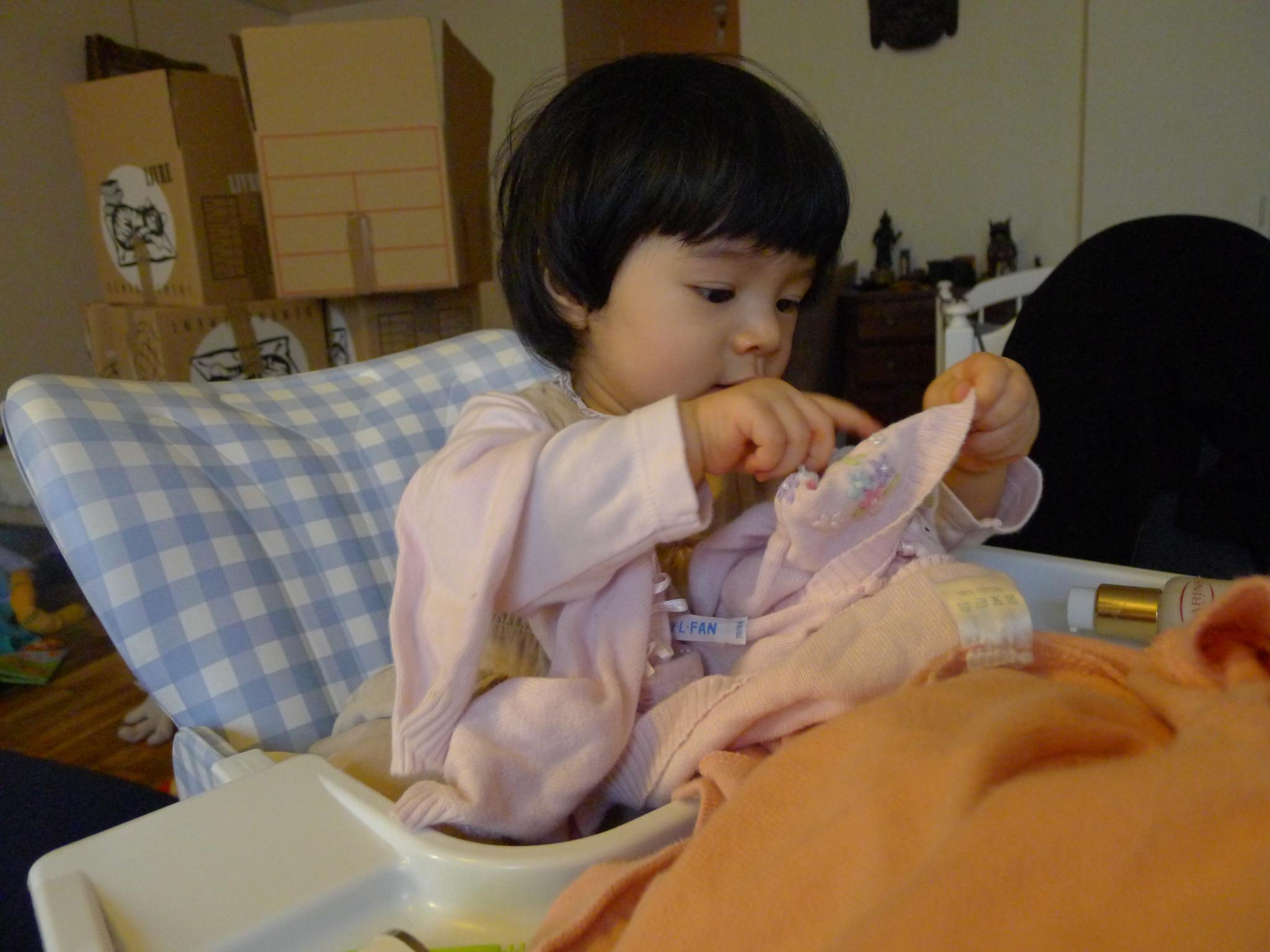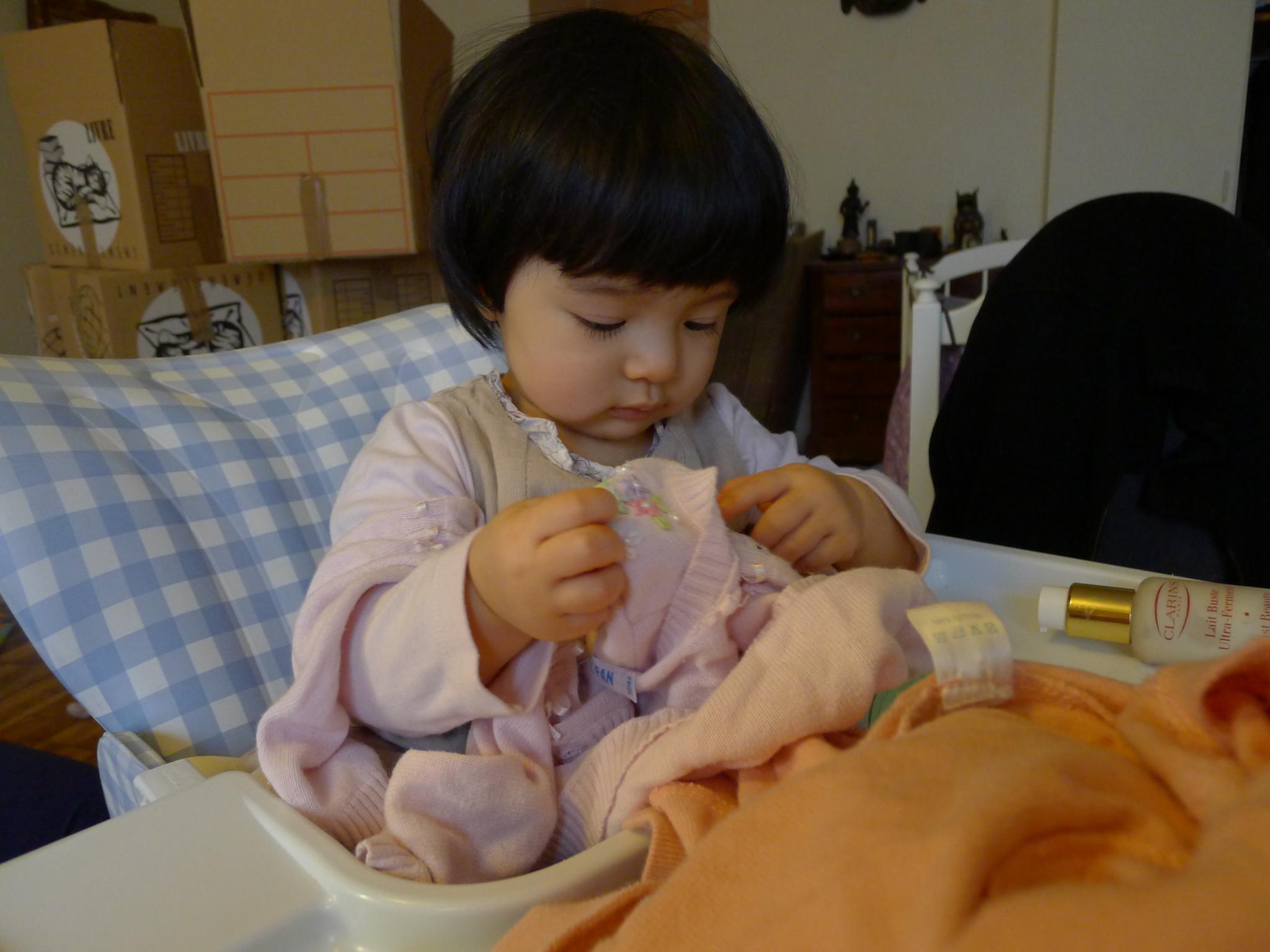 02.很有兴趣地研究小开衫。身后是我们打包好的一部分箱子。