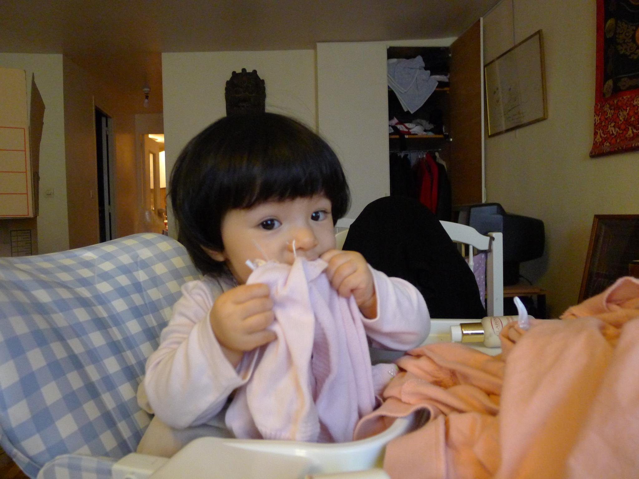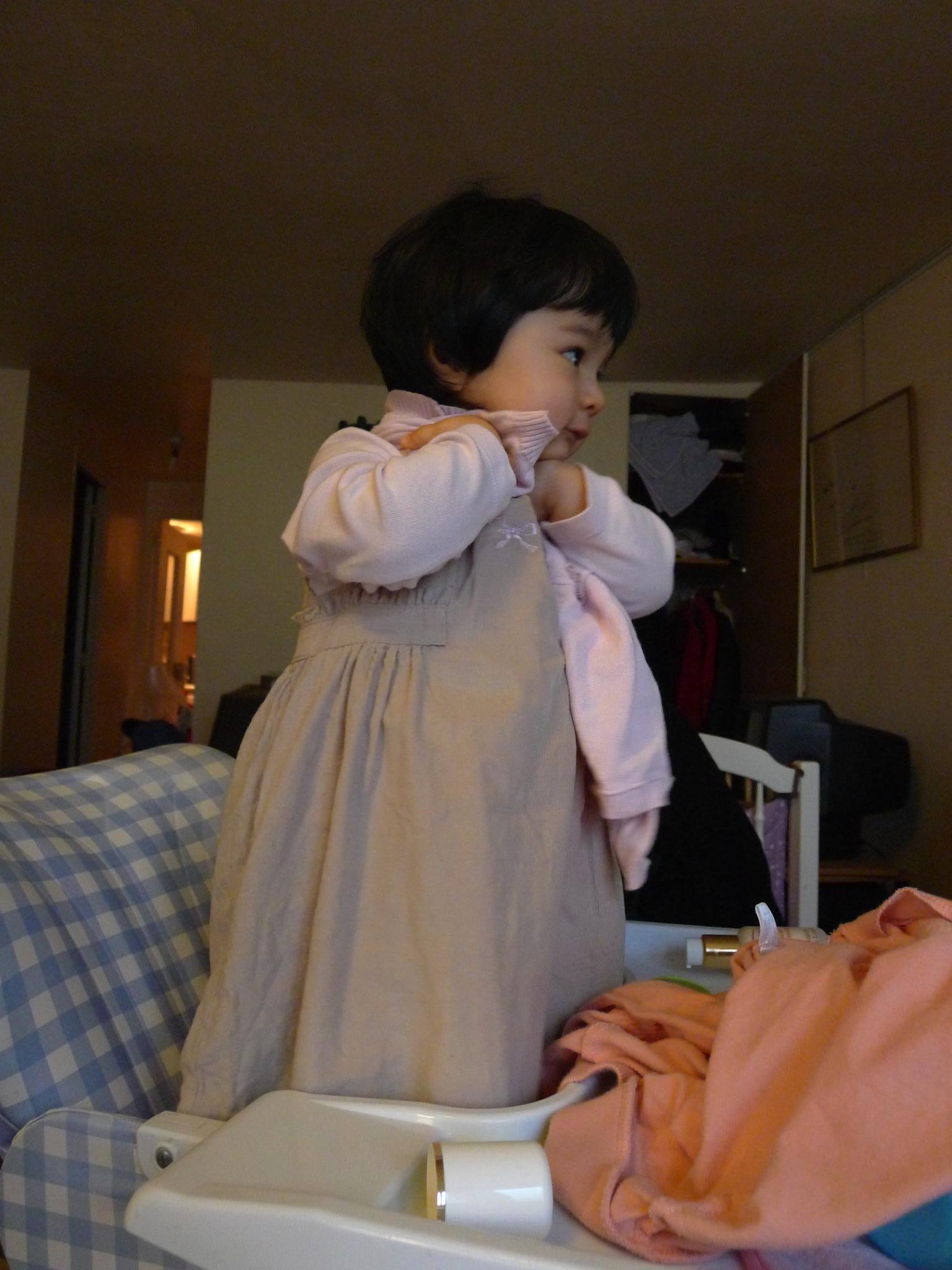 08.最近很想学穿衣,总把小衣服往自己身上绕。也总把小鞋子套在自己的小脚丫上,还经常踏在我或者袁志文的拖鞋里踢踢踏踏地走路!