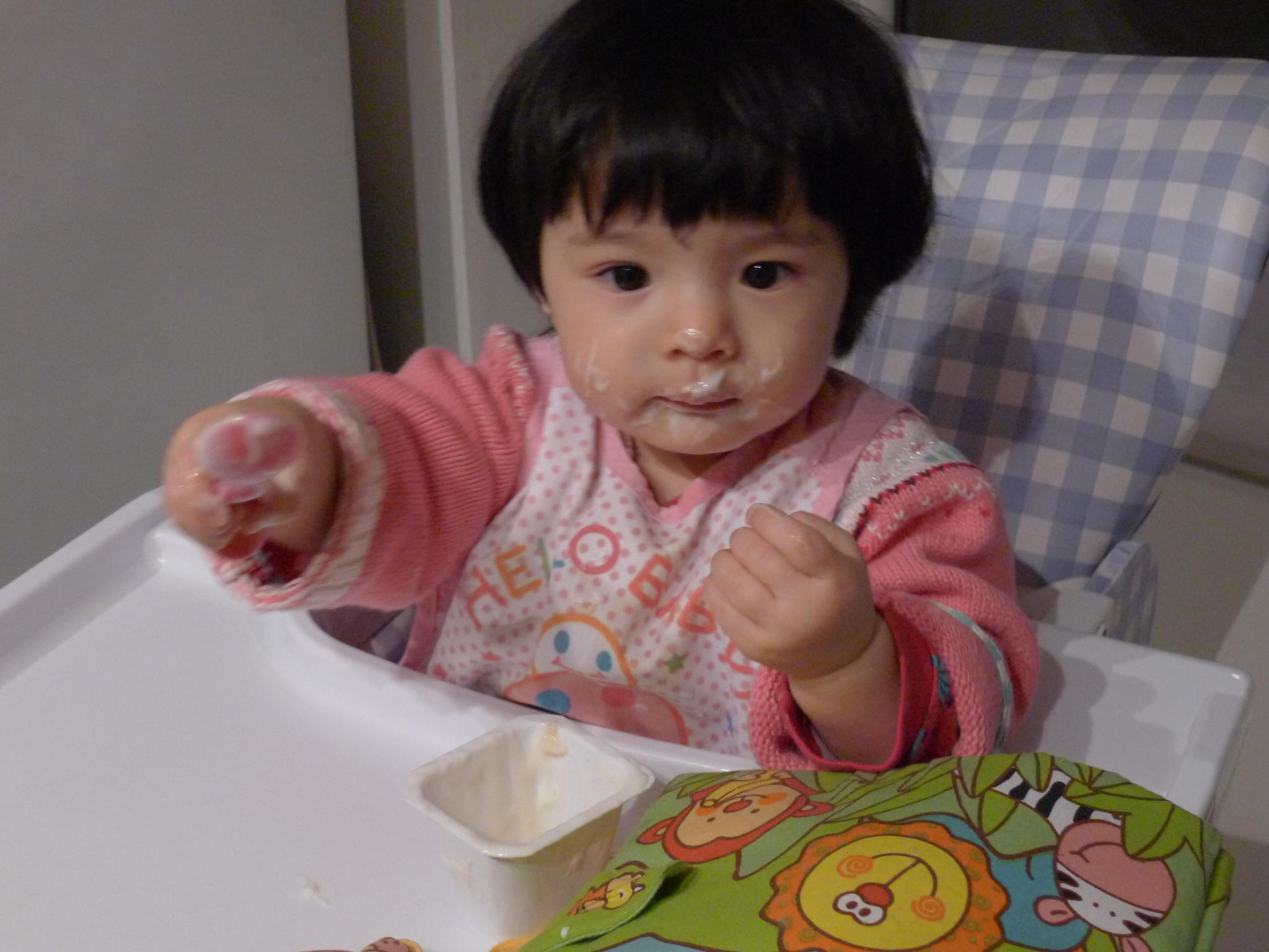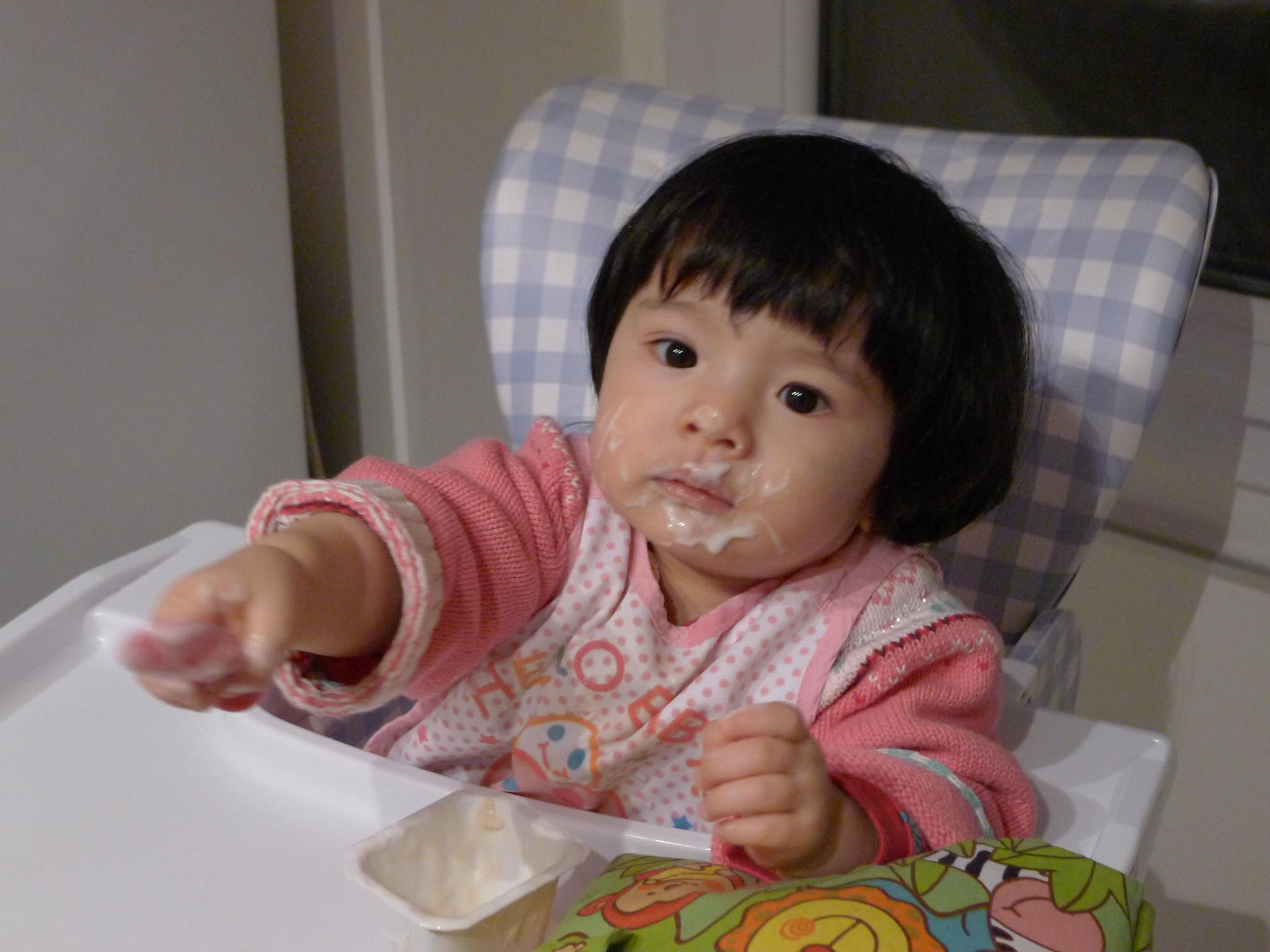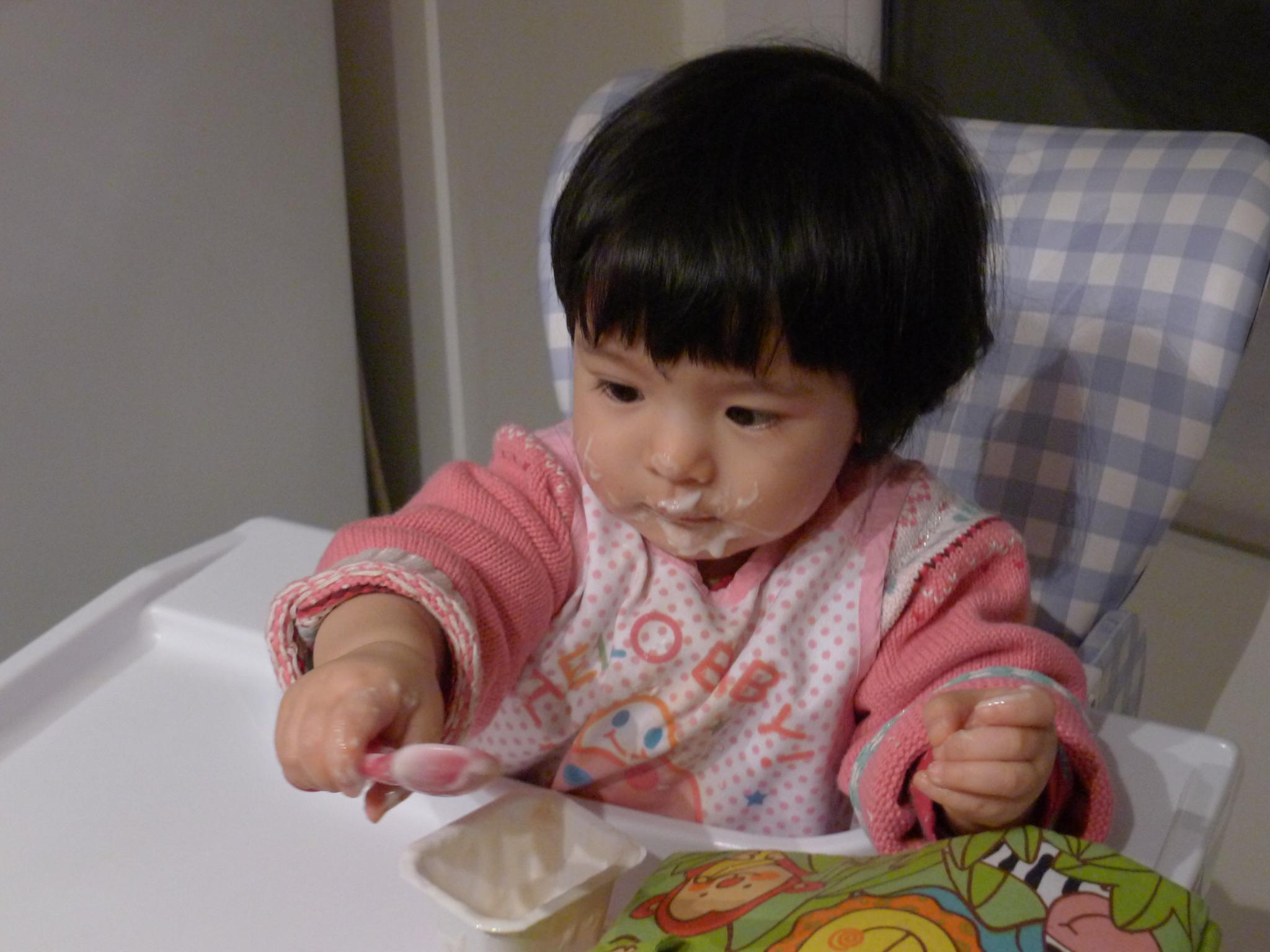 01.Amelie会自己拿着勺子吃饭了。几个星期前我们喂饭时,她开始自己要求拿勺子,在我们帮助下吃一点儿,后来逐渐拒绝我们帮忙,自己独个儿吃,吃得半张小脸都是,像只小花猫。1月22日拍的照片是正在吃饭后甜点酸奶。