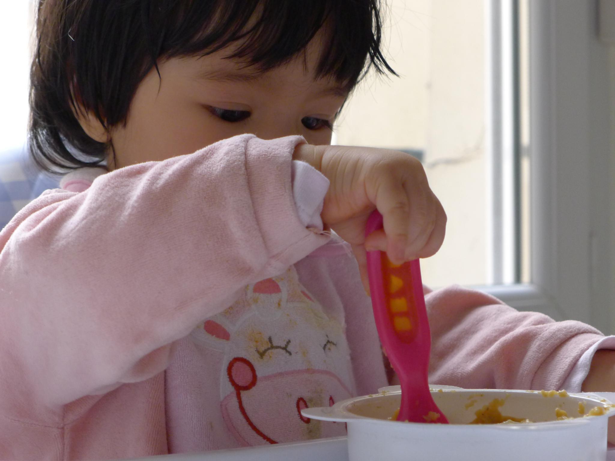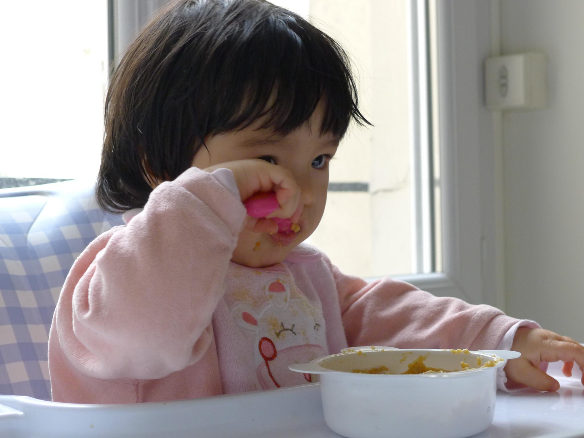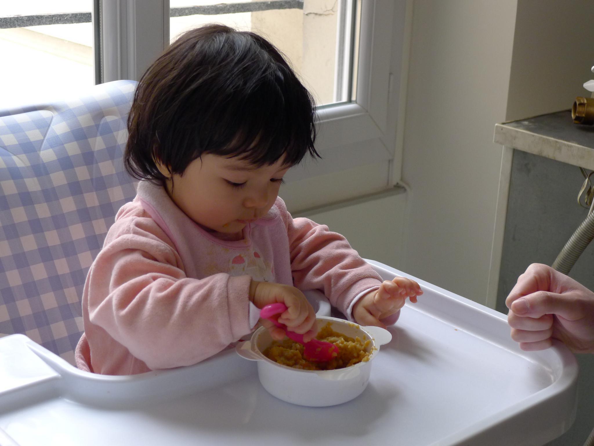 amelie: 需要严格的监督,不然就会把食物都倒在餐椅上,还要觑空喂几下,不然她自己吃得还是太慢。现在喂饭都是她自己一个勺子,我一个勺子,不过她都不高兴我们帮忙,总是把我们手里的勺子抢过去,自己像个双枪老太太一样使双勺。