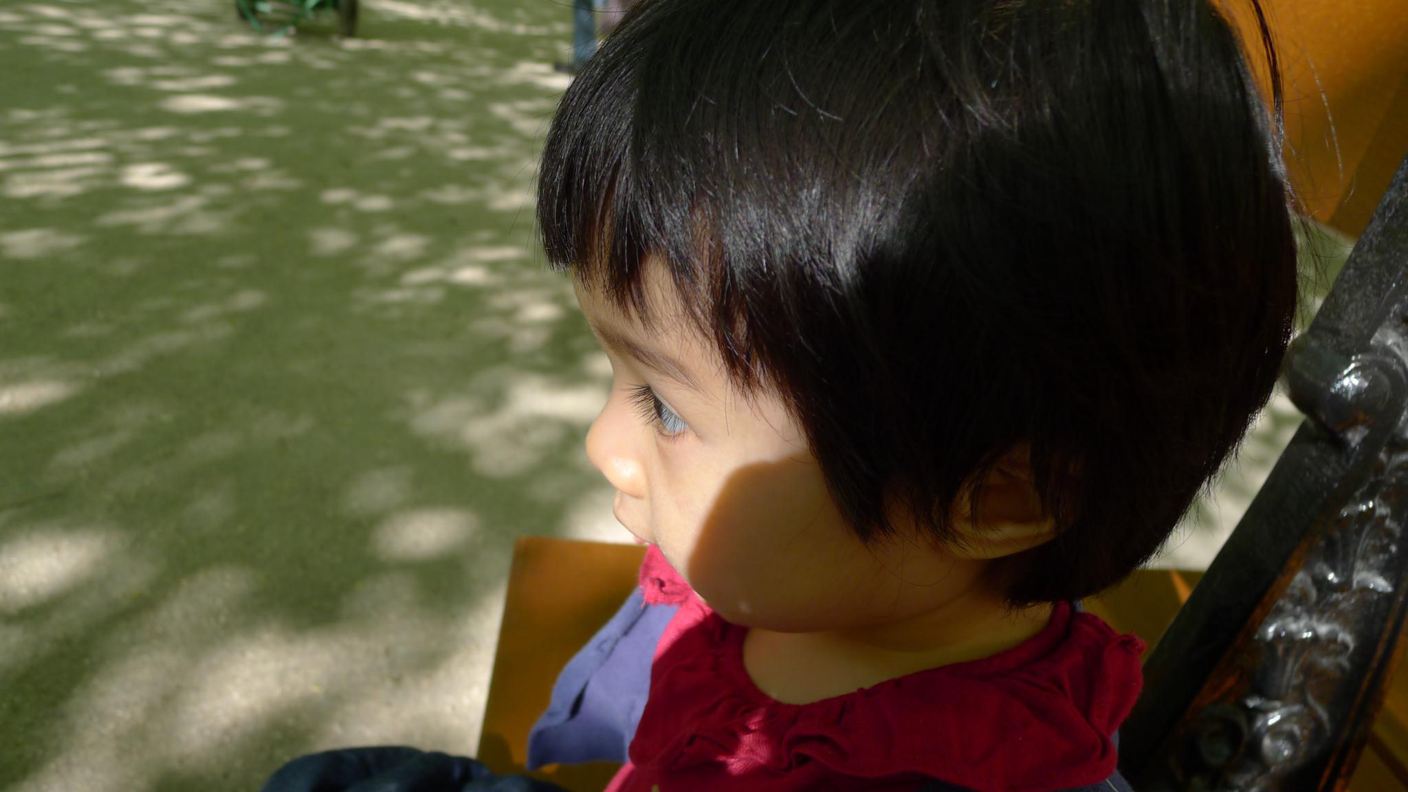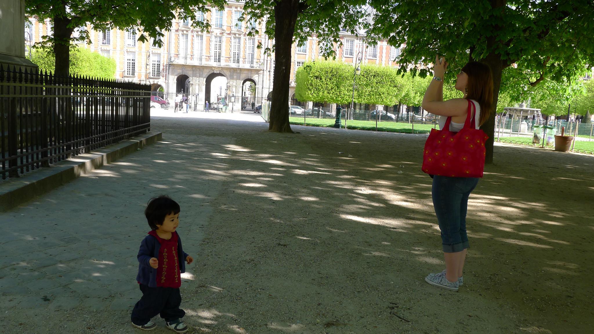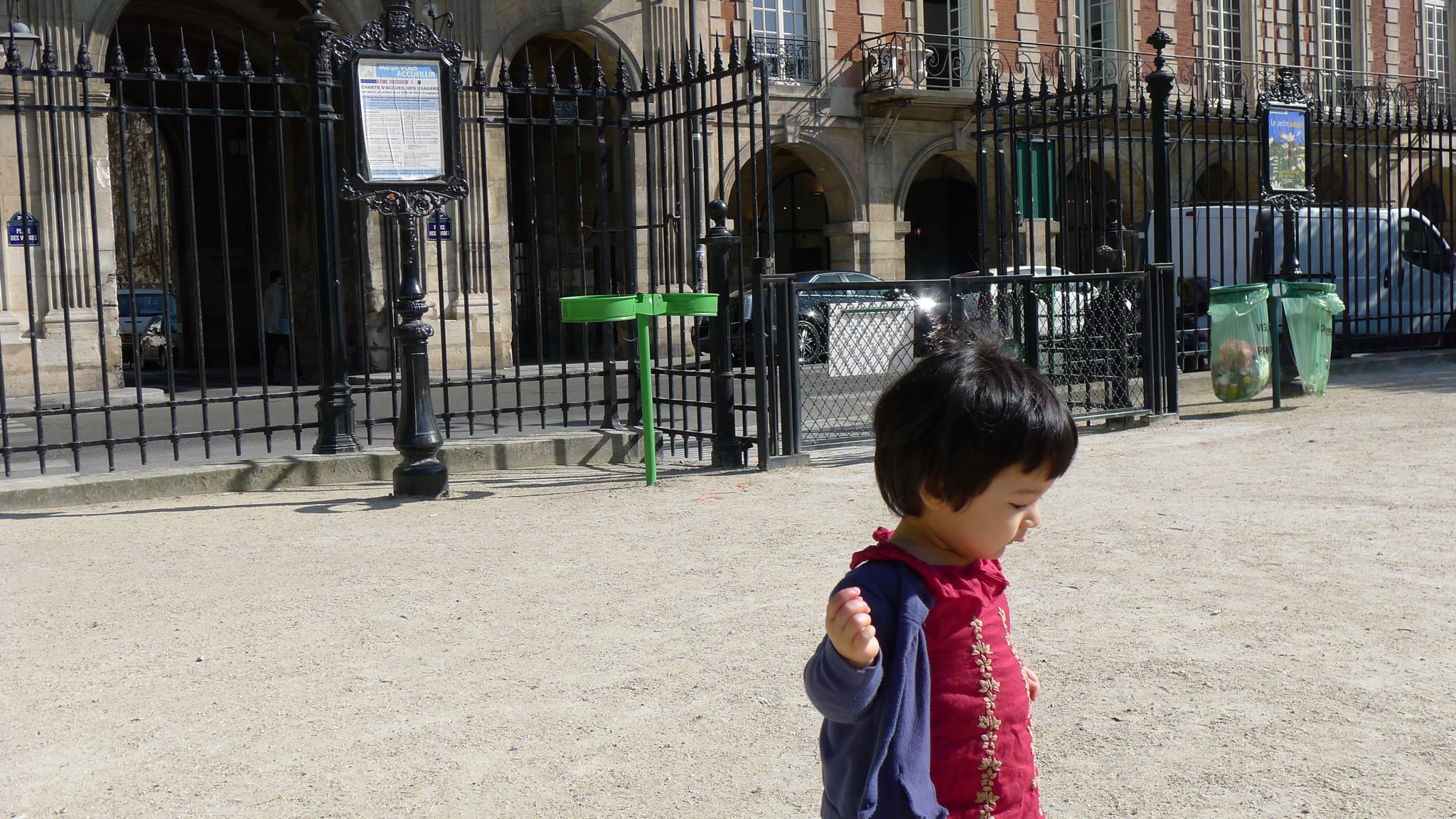 01.早上带Amelie去孚日广场玩。孚日广场被誉为巴黎最美的广场之一,也是最古老的广场,由亨利四世兴建于17世纪初。春天阳光树影下的小妞,自己要求坐在公园长椅上。