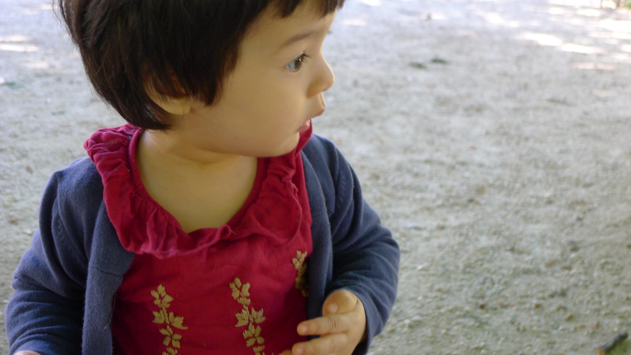 02.在公园的沙坑旁边遇到两个托儿所小朋友,人家热情招呼,Amelie理也不理,自顾自在公园逛了一大圈。——这张有木有街拍范儿?
