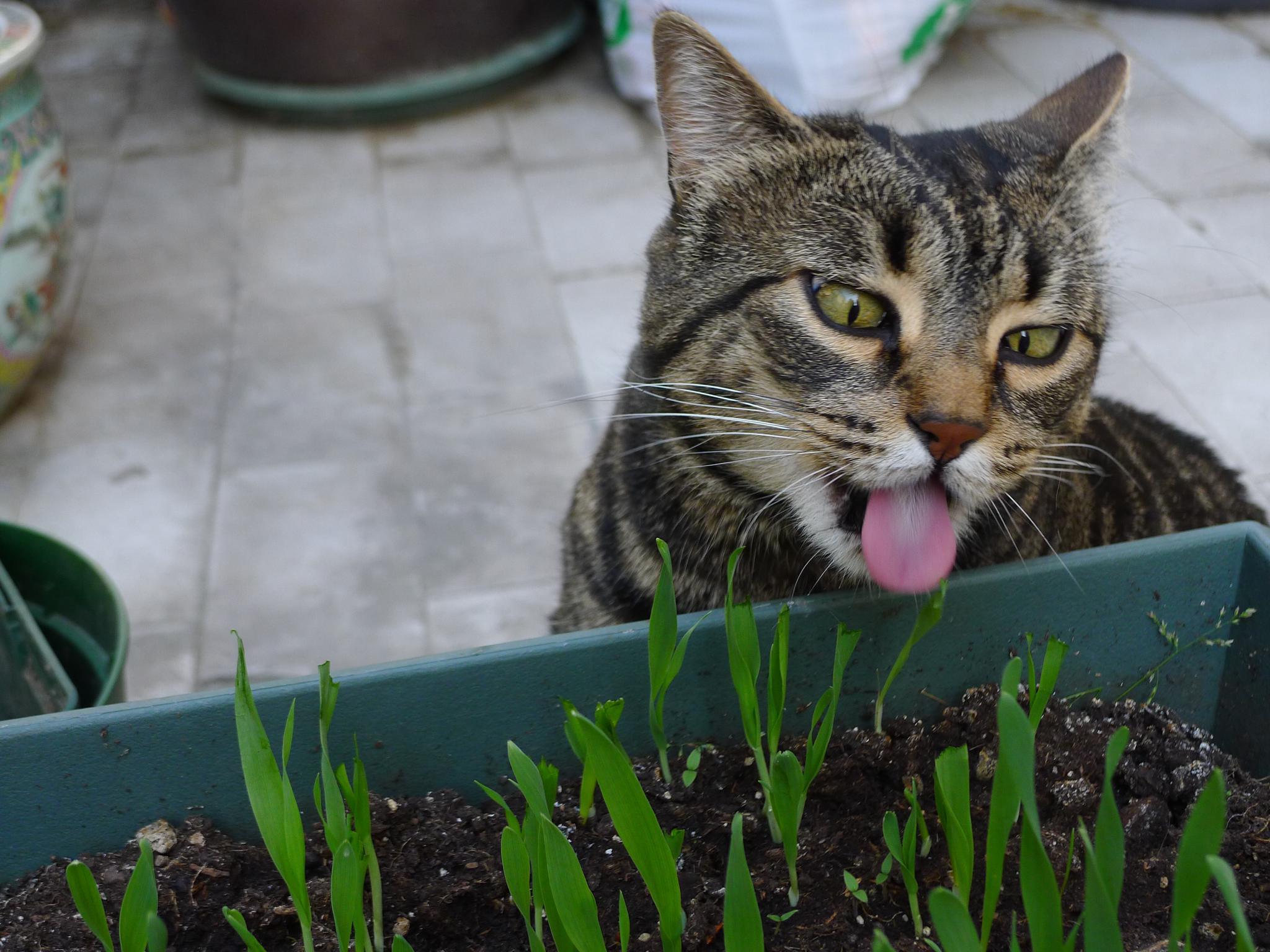 02.在院子里看阿冲吃猫草,有时候Amelie也凑过去模仿阿冲的动作,伸出小舌头“啊呜啊呜”地作势要吃草。