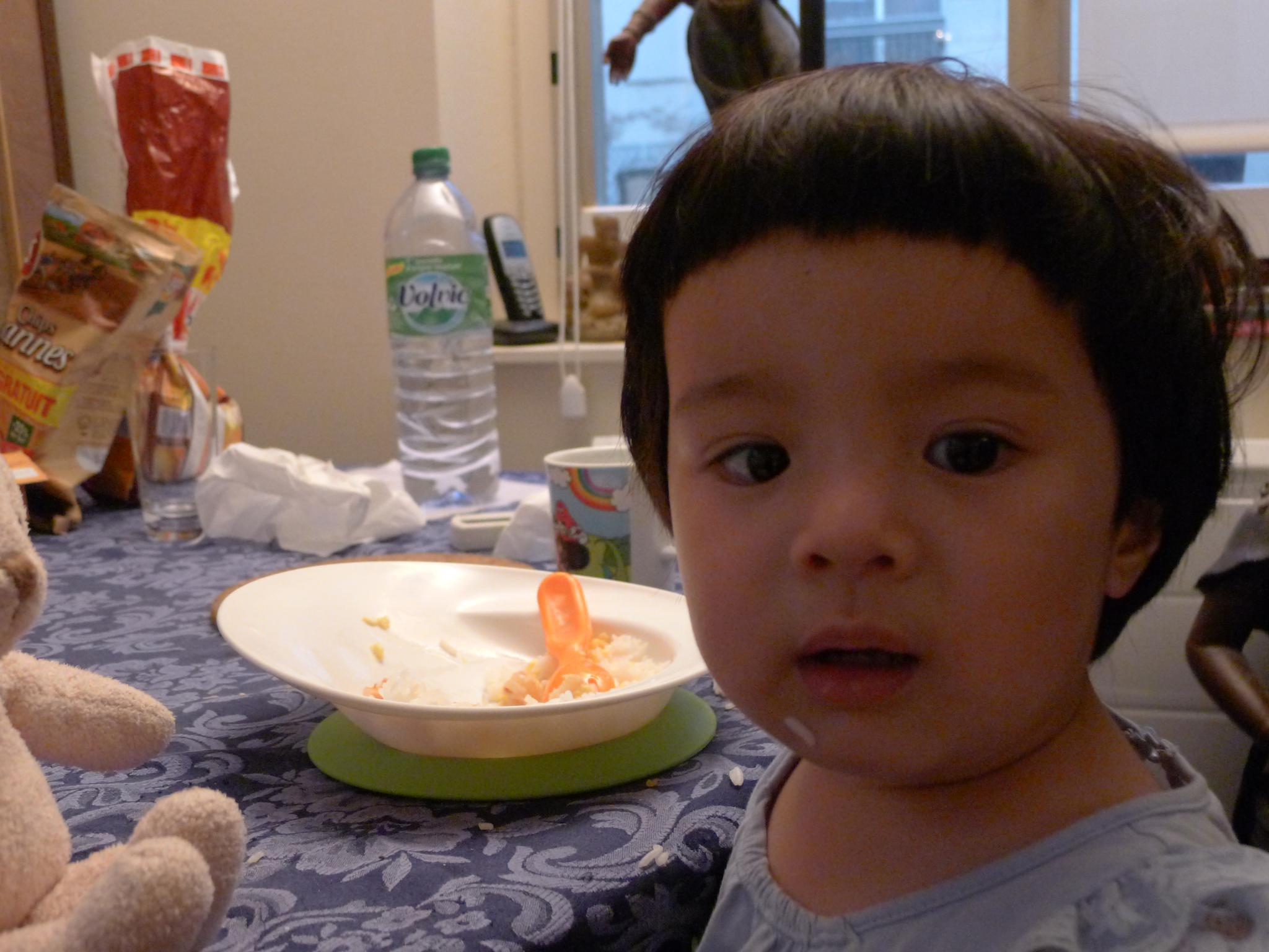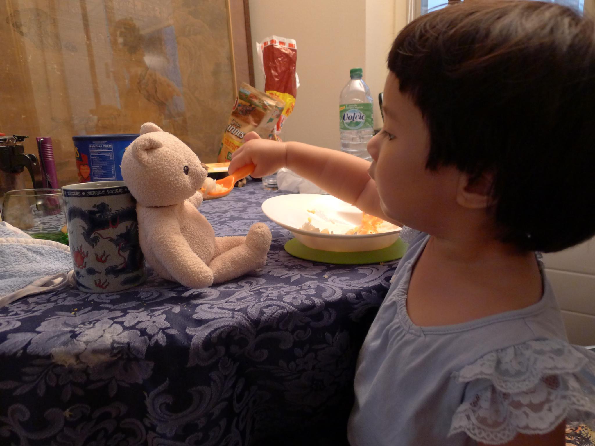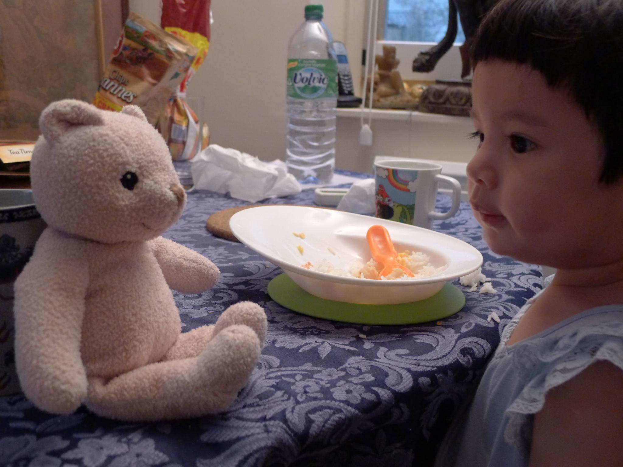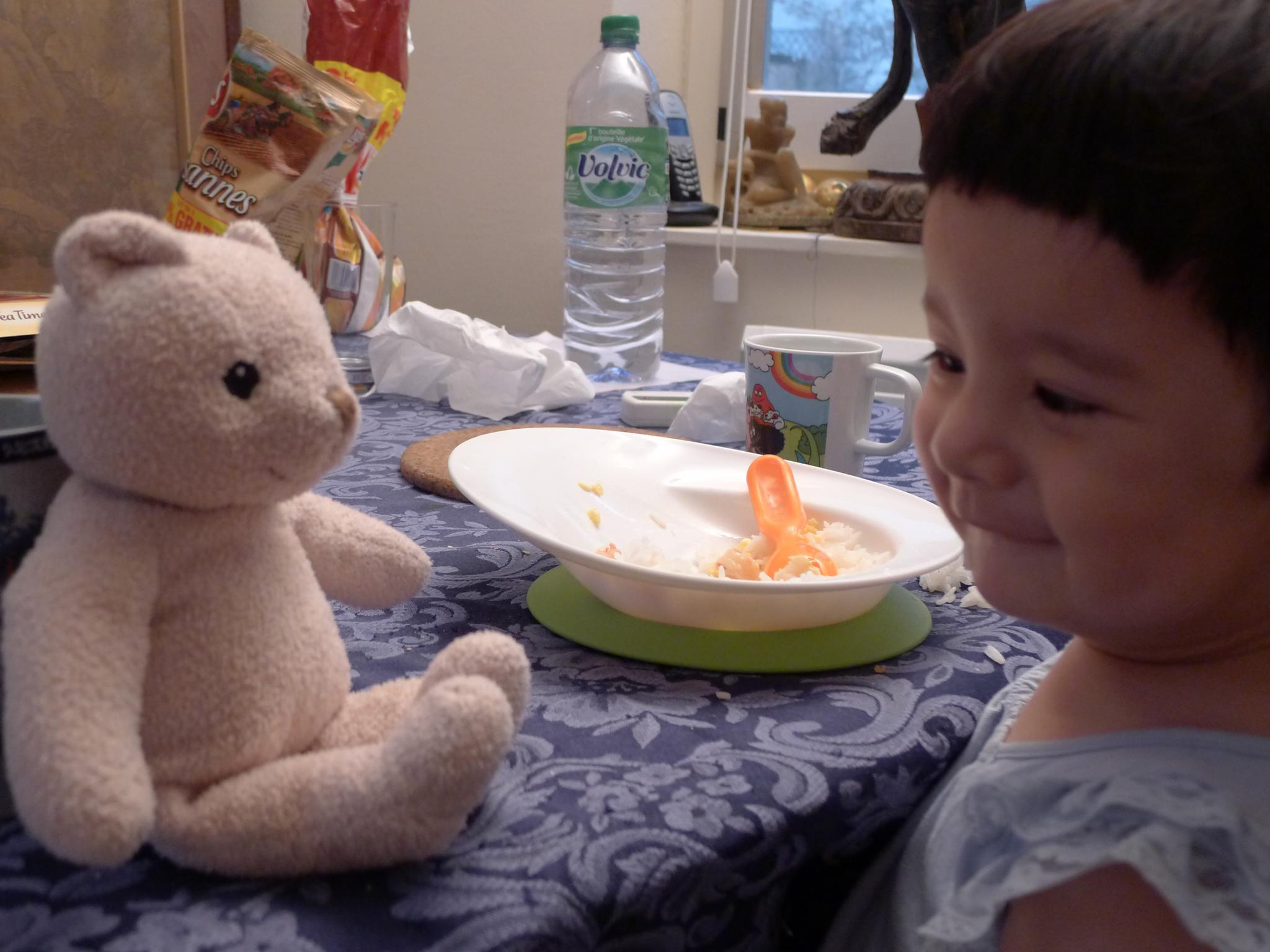 1正吃着饭,Amelie忽然大叫:“Doudou!”是她的安抚物小熊,法语里管小孩子的安抚物叫“doudou”。我赶紧拿过来,她让doudou端端正正靠在自己面前的一只茶杯上坐好,拿勺子给它喂饭。