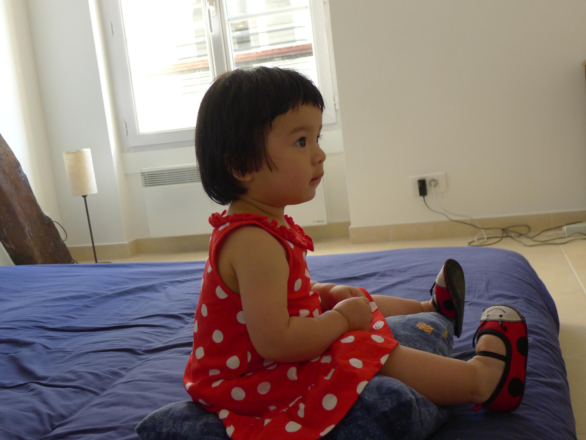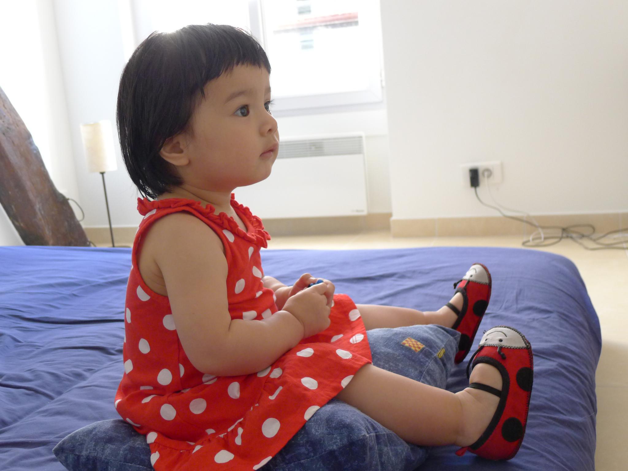 1新床还没送到,Amelie坐在原来的床上看动画片。刚洗完澡,穿红色波点裙子配小瓢虫鞋子。