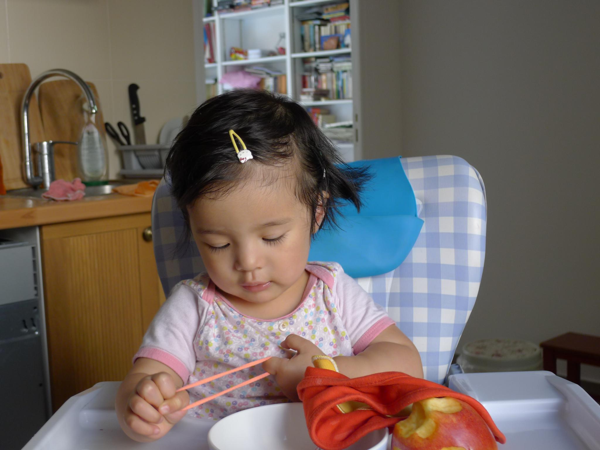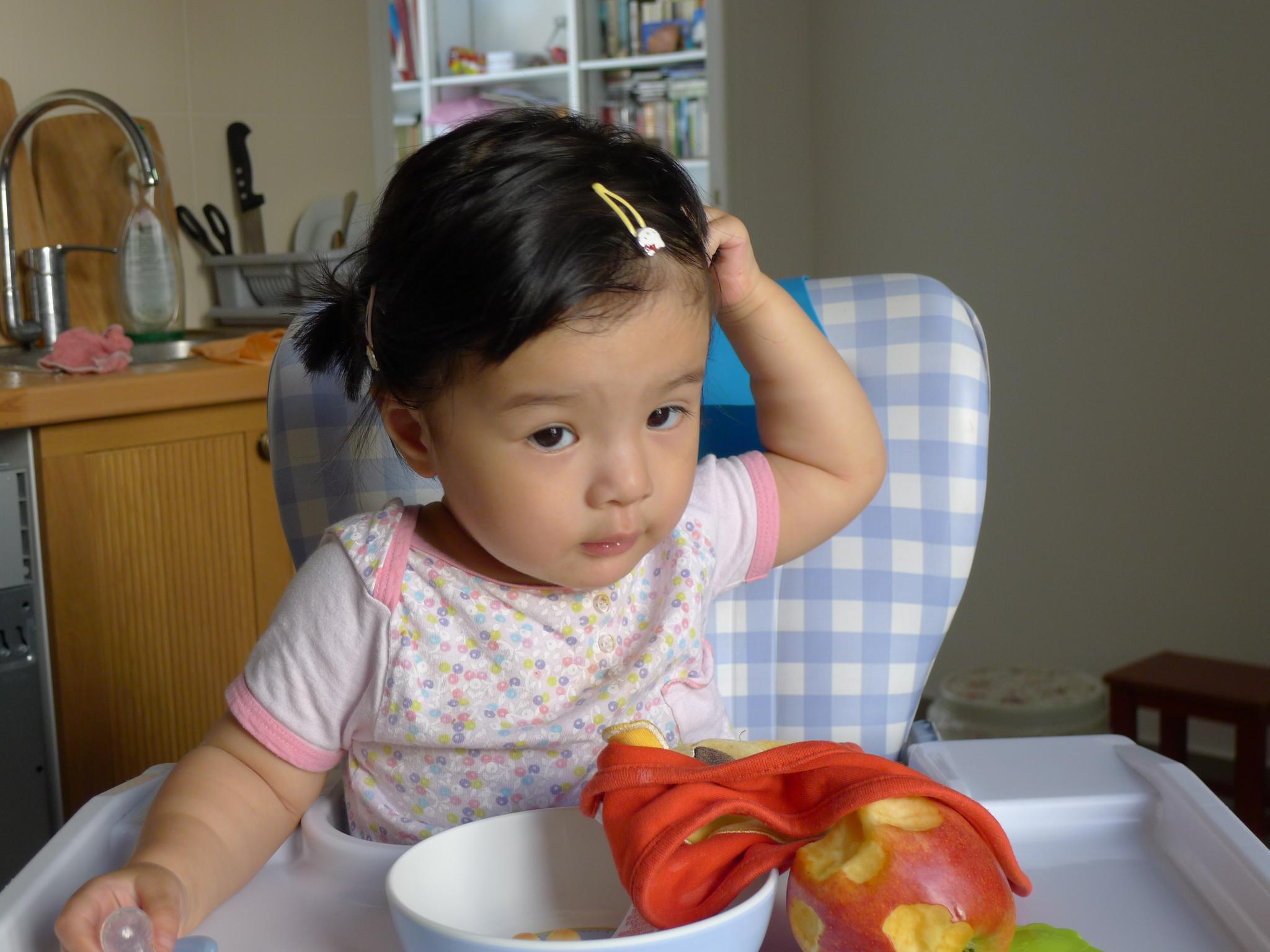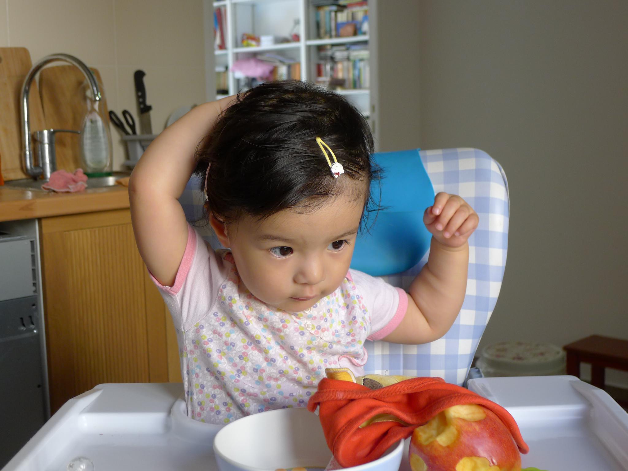 01.这几天又非常热,看她热得满头大汗,就给她扎了小辫子,但是她总想揪下来。