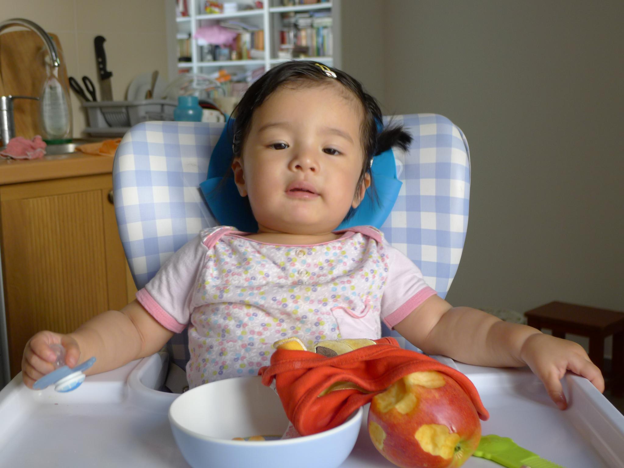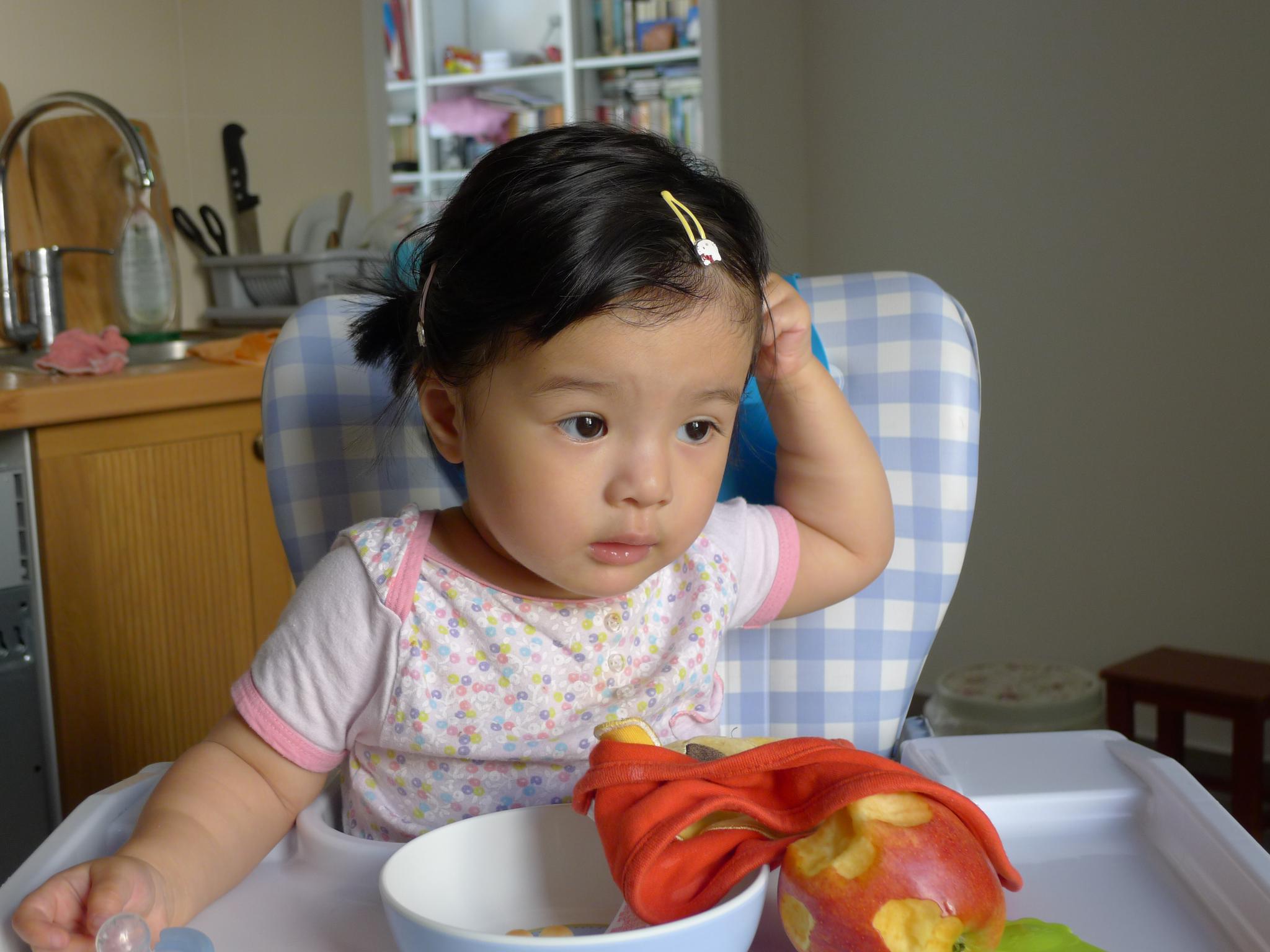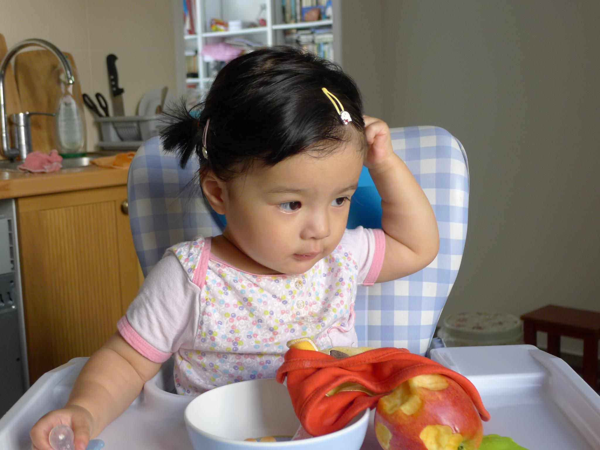 01.这几天又非常热,看她热得满头大汗,就给她扎了小辫子,但是她总想揪下来。