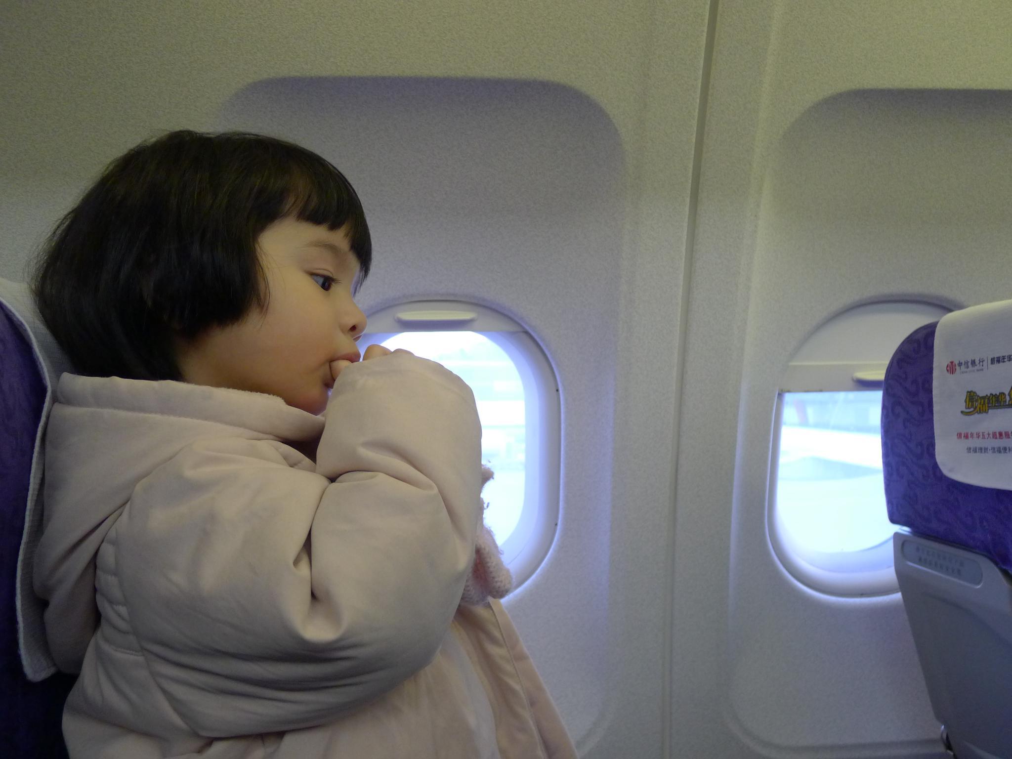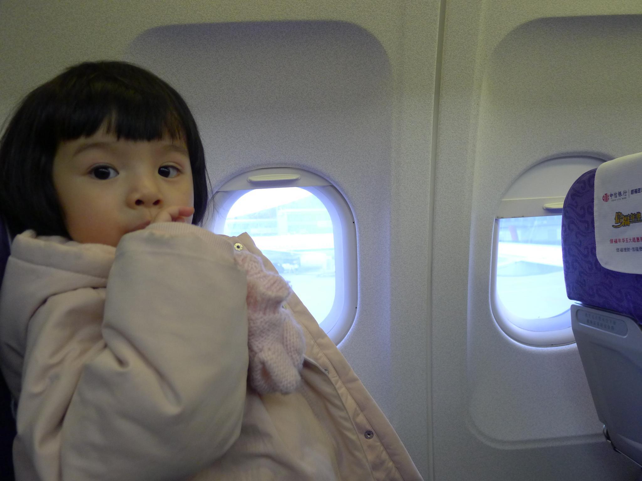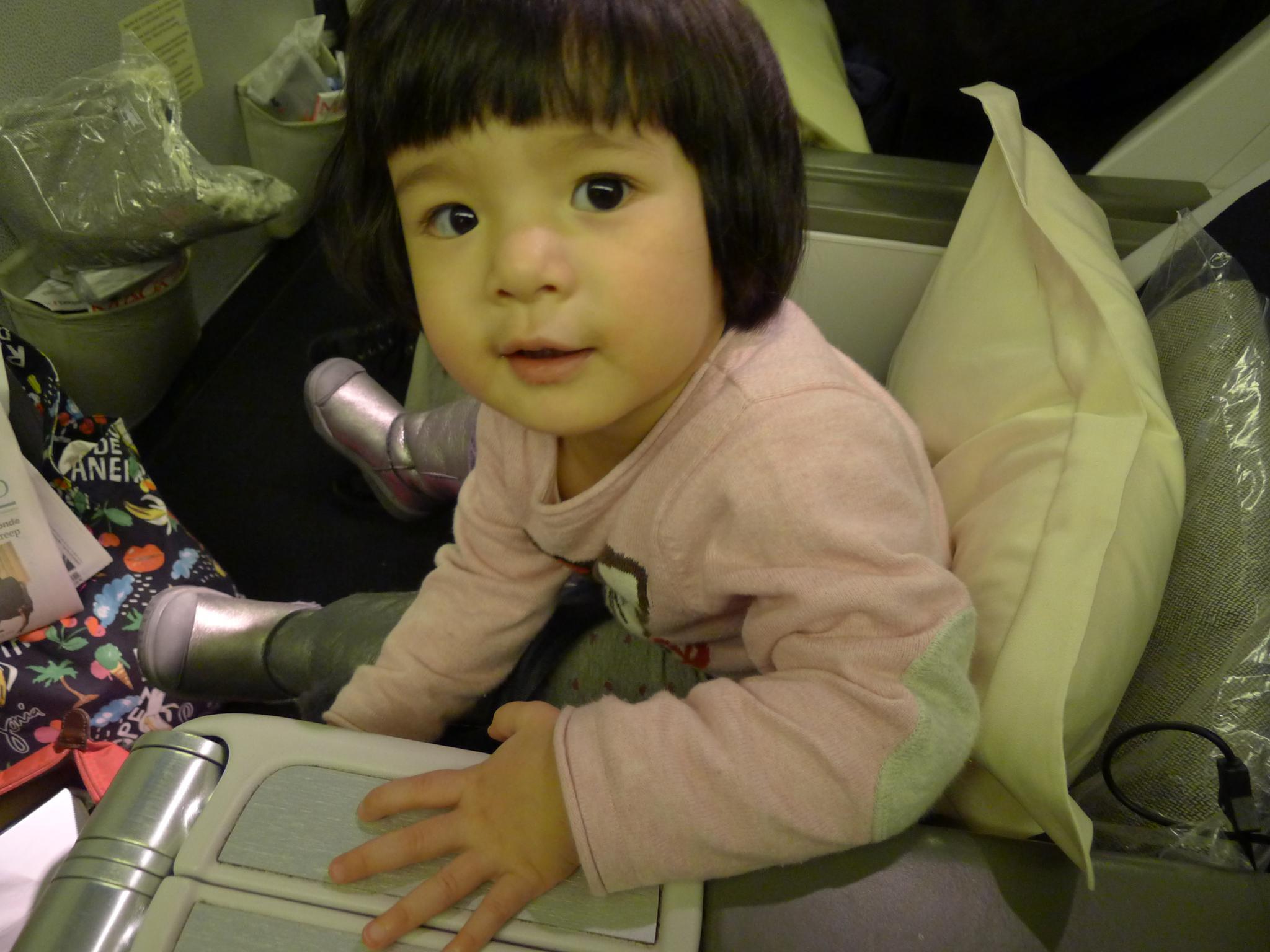 01.Amelie已经是第二次坐飞机啦,不过这回是第一次有自己的座位。很幸运地在换登机牌的时候被升到了商务仓了,不过问题是扶手不能移动,Amelie睡觉的时候好几次从座位上滑了下来,一脸茫然地站着。