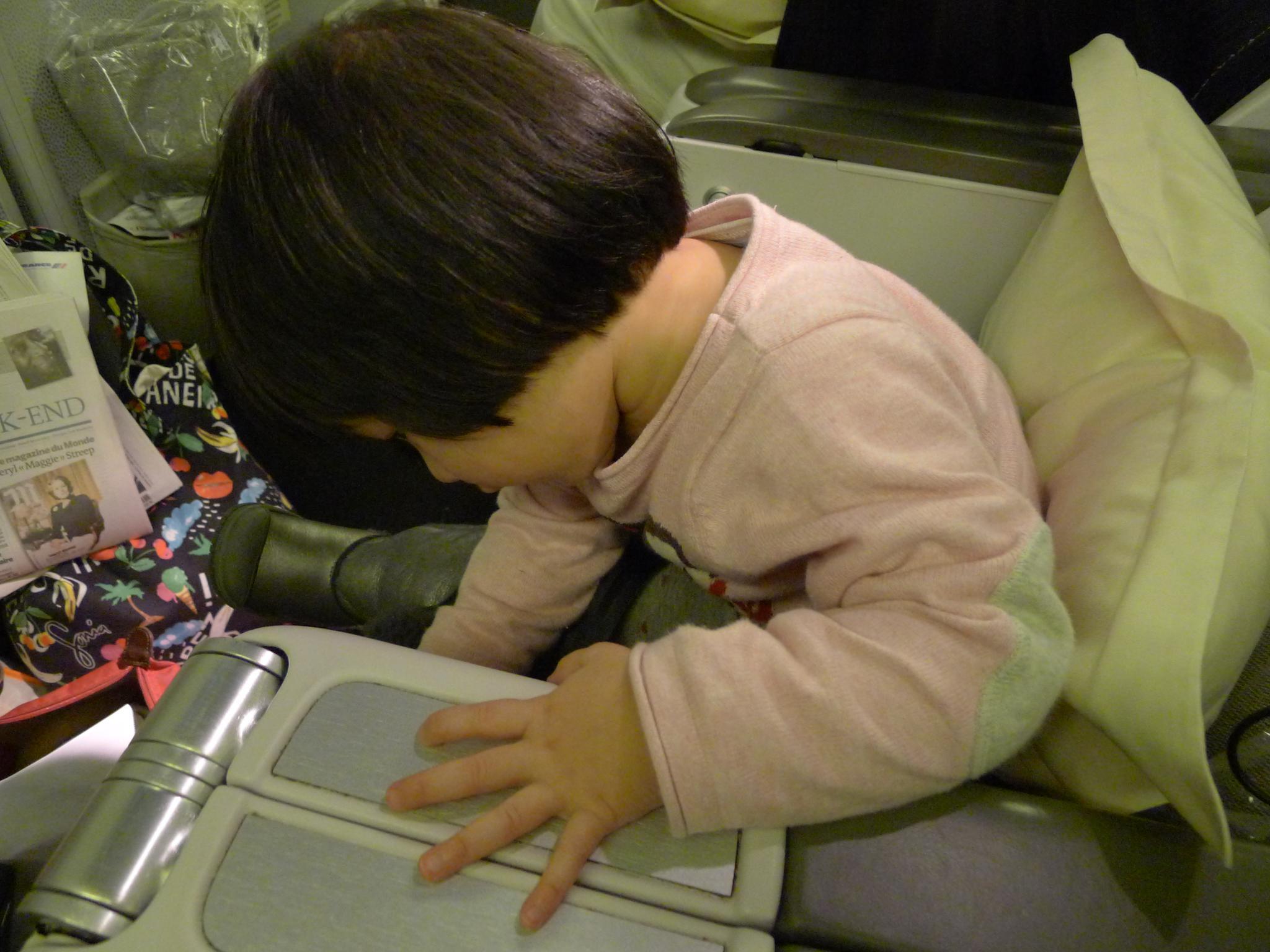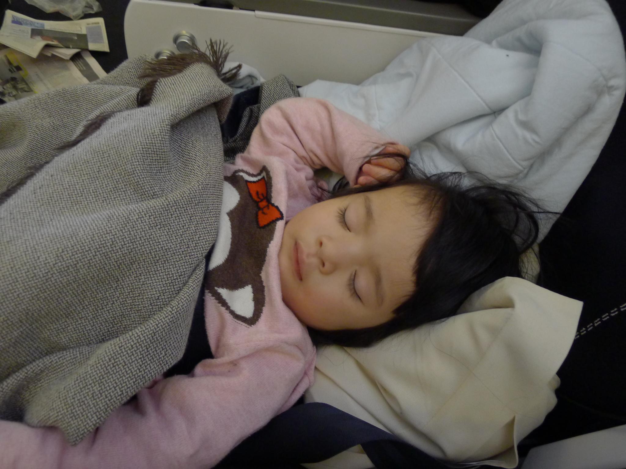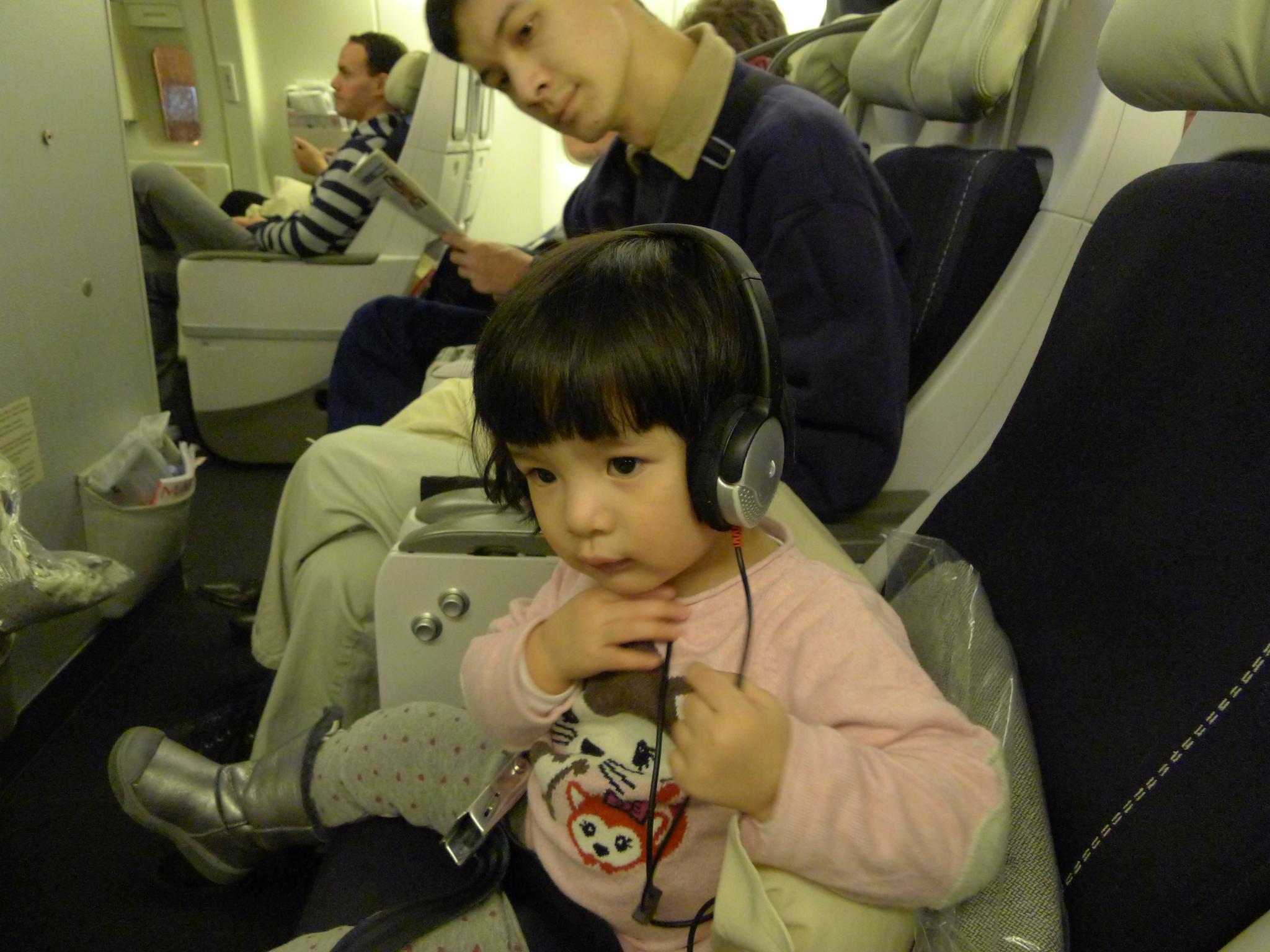 01.Amelie已经是第二次坐飞机啦,不过这回是第一次有自己的座位。很幸运地在换登机牌的时候被升到了商务仓了,不过问题是扶手不能移动,Amelie睡觉的时候好几次从座位上滑了下来,一脸茫然地站着。
